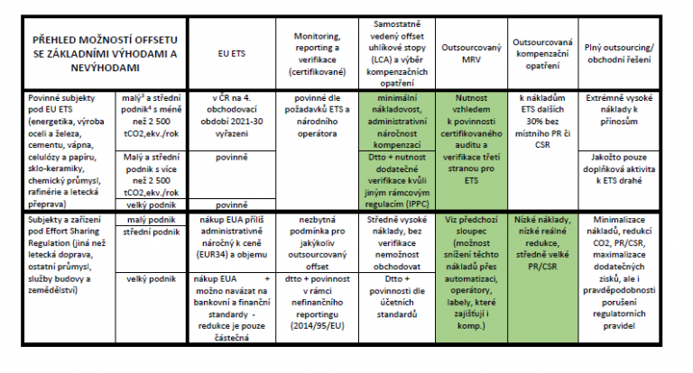 Popularita offsetu je pochopitelná, neboť je flexibilní, uživatelsky jednoduchý i snadno dostupný a tedy zdánlivě snadno aplikovatelný pro jakoukoliv firmu v jakékoliv situaci. Nicméně realita je složitější kvůli křížení povinných vertikálních i horizontálních regulačních mechanismů s dobrovolnými nástroji a procesy, komplexitě akreditačních a verifikačních standardů a zároveň boomu nabídky. Proto se níže pokusíme podat základní regulační vymezení pro fungování offsetů, aby si každá firma mohla zodpovědně vybrat, ať již cestu, kterou se při snižování své uhlíkové stopy bude ubírat, tak i z pestré nabídky offsetů.
