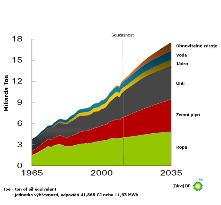 Společnost BP (British Petroleum) nedávno vydala pravidelný report s výhledem energetické poptávky na příští dvě dekády. Podle BP bude do roku 2035 potřeba o 41% více energetických zdrojů zahrnující ropu, zemní plyn, uhlí, jádro, vodu a obnovitelné zdroje. S roustoucí spotřebou je předpokládán i celosvětový nárůst produkce CO2 o 29%. Nárůst potřeby bude zapříčiněn přávažně roustoucí spotřebou v zemích mimo OECD (Organisation for Economic Co-operation and Development). Například v EU je předpoklad dokonce klesající potřeby a to o 6% do roku 2035.