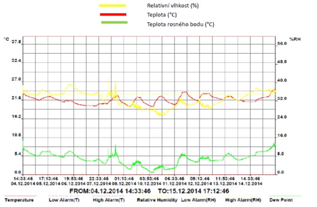 Výstup z jednoho z dataloggerů umístěných v prodejně zobrazuje průběh teploty a vlhkosti po dobu měření
