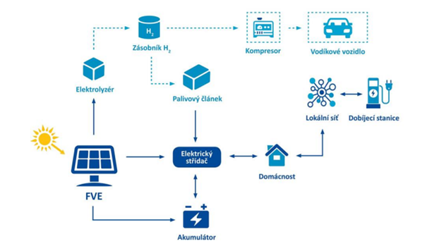 Technologie výroby vodíku je tak vhodné instalovat v provozech, které jsou spolu napájeny z obnovitelných zdrojů energie (OZE), např. ze střešních fotovoltaických elektráren (FVE). Toto schéma je vhodné mimo jiné proto, že výroba vodíku může být výhodnou alternativou využití přebytků energie z FVE. Konvenční využití těchto přebytků (přetoky elektřiny do sítě) se může stát neefektivním kvůli stále rostoucímu instalovanému výkonu FVE v české elektrizační soustavě a s tím spojeným poklesem ceny výkupu elektřiny z FVE. V některých případech může být z technických důvodů posílání přetoků do distribuční sítě dokonce zakázáno ze strany distributora.