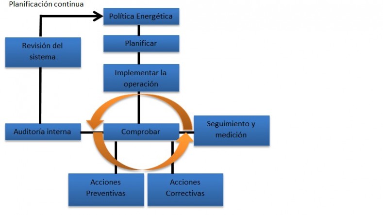 Implementación y operación - para determinar las responsabilidades de la implantacion del SGE sobre la complejidad del proceso de reducción energetica, la capacitación del personal para alcanzar los objetivos de la organización, para determinar el tipo de comunicación, para asegurar la documentación requerida y el archivo de datos y para el diseño y las compras necesarias para la reducción del consumo.